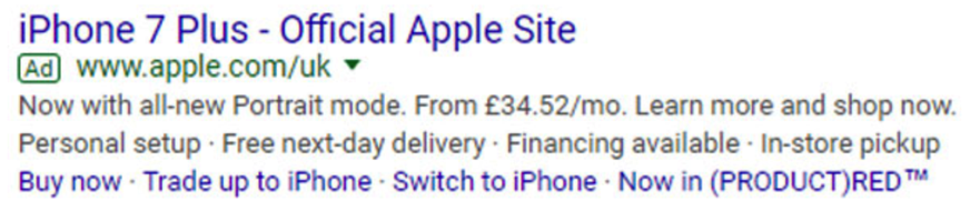 The ad’s headline starts with the name of the iPhone 7 Plus and states that it is from the official apple store. This lets people know that it is not from a different retailer or a scamming third party site. The description of the ad starts by listing some of the features the phone offers such as the “all-new portrait mode” and the monthly price. The ad lists features such as “personal setup”, “free next-day delivery” and “financing available”. These are great incentives that could convince one to buy a new phone. Finally, the ad finishes off with 4 call to action buttons. These buttons range from “buy now” to “switch to iPhone”. These calls to actions are a great way for people to take action right away whether it be buying the iPhone or learning more about the product.